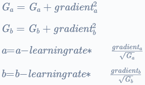 分别是参数 a 和 b 的梯度平方和。这些值会随着时间推移而累积到每个参数。参数a,b通过梯度下降步长学习,学习率乘以归一化梯度。