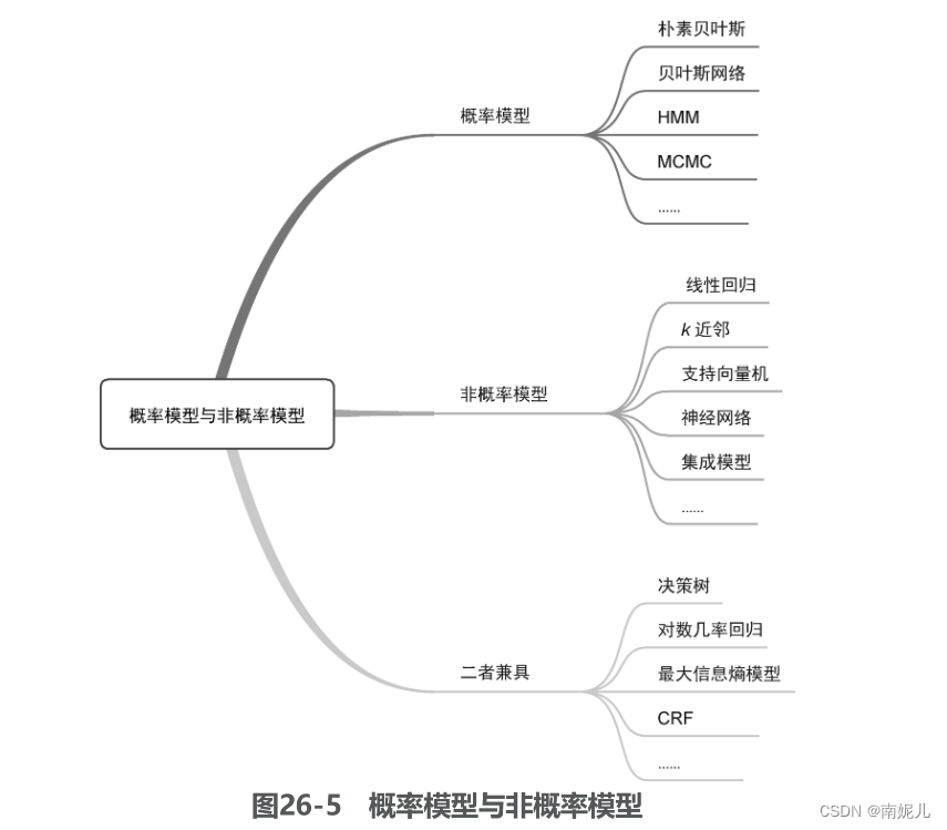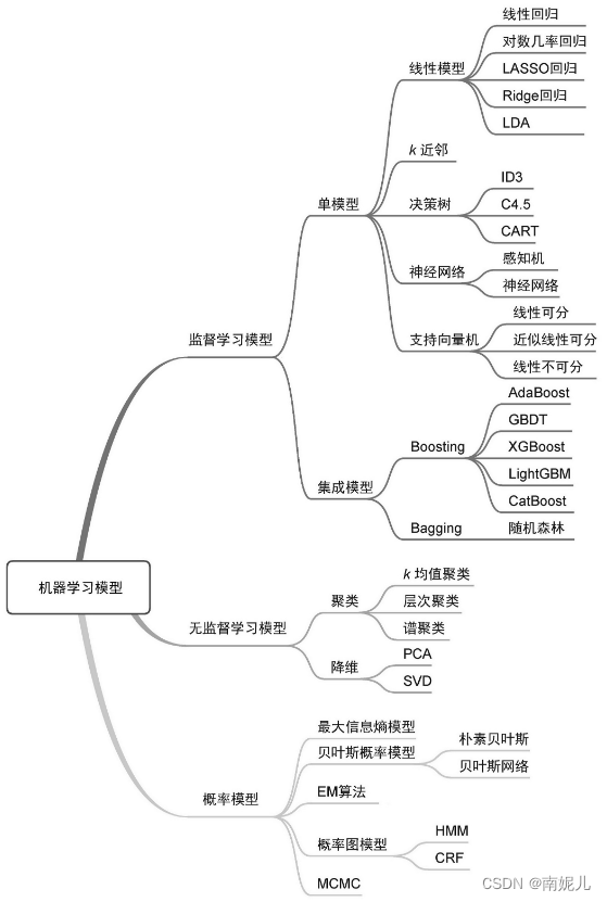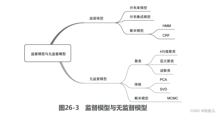 监督模型(supervised model)和无监督模型(unsupervised model)代表了机器学习模型最典型的划分方式,几乎所有模型都可以归类到这两类模型当中。监督模型是指模型在训练过程中根据数据输入和输出进行学习,监督模型包括分类(classification)、回归(regression)和标注(tagging)等模型。无监督模型是指从无标注的数据中学习得到模型,主要包括聚类(clustering)、降维(dimensionality reduction)和一些概率估计模型。