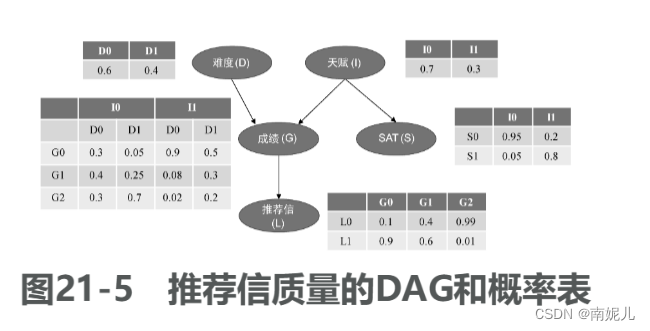 有向无环图(directed acyclic graph,DAG),每个结点表示一个特征或者随机变量,特征之间的关系则用箭头连线来表示。贝叶斯网络中每个结点还有一个与之对应的概率表。
