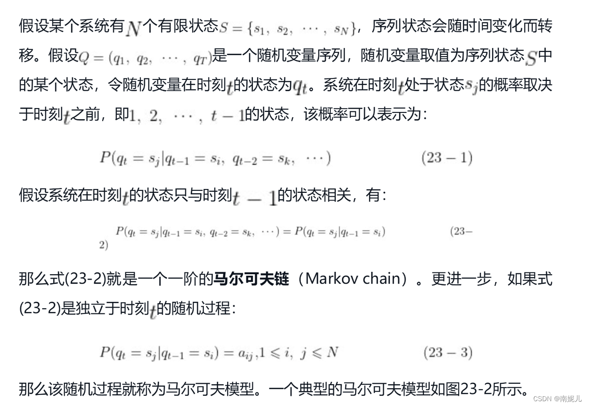马尔可夫链的定义比较简单。对于一个随机变量序列,假设某一时刻状态的取值只依赖于它的前一个状态,符合该特征的随机变量序列就可以称作马尔可夫链。