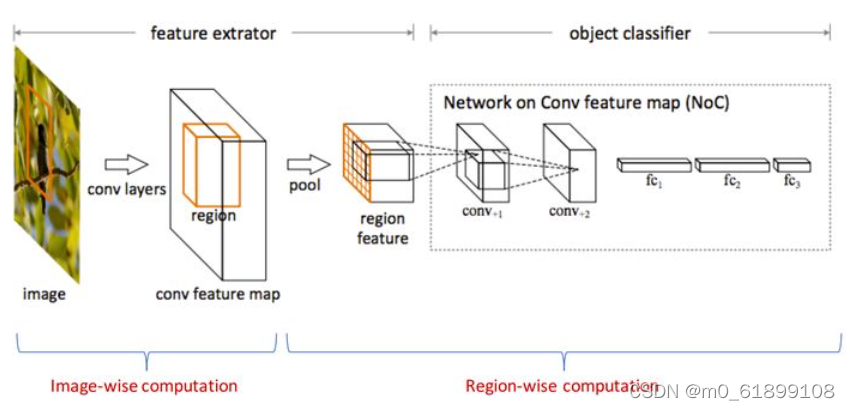 小结 基于候选区域的目标检测算法通常需要两步:第一步是从图像中提取深度特征,第二步是对每个候选区域进行定位(包括分类和回归)。其中,第一步是图像级别计算,一张图像只需要前馈该部分网络一次,而第二步是区域级别计算,每个候选区域都分别需要前馈该部分网络一次。因此,第二步占用了整体主要的计算开销。R-CNN, Fast R-CNN, Faster R-CNN, R-FCN这些算法的演进思路是逐渐提高网络中图像级别计算的比例,同时降低区域级别计算的比例。R-CNN中几乎所有的计算都是区域级别计算,而R-FCN中几乎所有的计算都是图像级别计算。