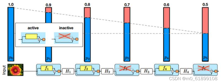 随机深度 ResNet的改进。旨在缓解梯度消失和加速训练。类似于随机失活(dropout),其以一定概率随机将residual模块失活。失活的模块直接由短路分支输出,而不经过有参数的分支。在测试时,前馈经过全部模块。随机深度说明residual模块是有信息冗余的。