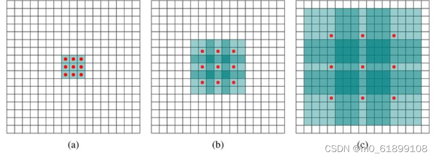 扩张卷积(dilated convolution) 经常用于分割任务以增大有效感受野的一个技巧。标准卷积操作中每个输出神经元对应的输入局部区域是连续的,而扩张卷积对应的输入局部区域在空间位置上不连续。扩张卷积向标准卷积运算中引入了一个新的超参数扩张量(dilation),用于描述输入局部区域在空间位置上的间距。当扩张量为1时,扩张卷积退化为标准卷积。扩张卷积可以在参数量不变的情况下有效提高感受野。例如,当有多层3×3标准卷积堆叠时,第l 层卷积(l 从1开始)的输出神经元的感受野为2l +1。与之相比,当有多层3×3扩张卷积堆叠,其中第l 层卷积的扩张量为2^{l-1}时,第l 层卷积的输出神经元的感受野为2^{l +1}-1。感受野越大,神经元能利用的相关信息越多。和经典计算机视觉手工特征相比,大的感受野是深度学习方法能取得优异性能的重要原因之一。