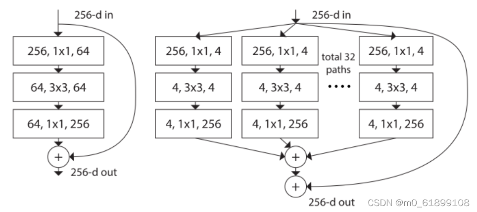 ResNeXt ResNet的另一改进。传统的方法通常是靠加深或加宽网络来提升性能,但计算开销也会随之增加。ResNeXt旨在不改变模型复杂度的情况下提升性能。受精简而高效的Inception模块启发,ResNeXt将ResNet中非短路那一分支变为多个分支。和Inception不同的是,每个分支的结构都相同。ResNeXt的关键点是: