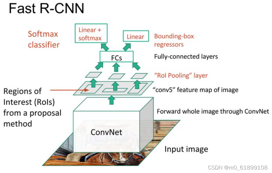 Fast R-CNN R-CNN的弊端是需要多次前馈网络,这使得R-CNN的运行效率不高,预测一张图像需要47秒。Fast R-CNN同样基于候选区域进行目标检测,但受SPPNet启发,在Fast R-CNN中,不同候选区域的卷积特征提取部分是共享的。也就是说,我们先将整副图像前馈网络,并提取conv5卷积特征。之后,基于在原始图像上运行候选区域生成算法的结果在卷积特征上进行采样,这一步称为兴趣区域汇合(感兴趣区域池化,ROI pooling)。最后,对每个候选区域,进行目标定位,即两分支(分类+回归)输出。