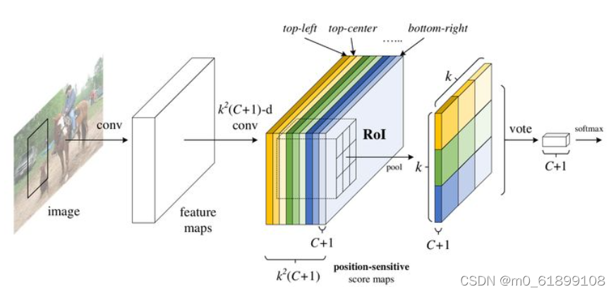 R-FCN Faster R-CNN在RoI pooling之后,需要对每个候选区域单独进行两分支预测。R-FCN旨在使几乎所有的计算共享,以进一步加快速度。由于图像分类任务不关心目标具体在图像的位置,网络具有平移不变性。但目标检测中由于要回归出目标的位置,所以网络输出应当受目标平移的影响。为了缓和这两者的矛盾,R-FCN显式地给予深度卷积特征各通道以位置关系。在RoI汇合时,先将候选区域划分成3×3的网格,之后将不同网格对应于候选卷积特征的不同通道,最后每个网格分别进行平均汇合。R-FCN同样采用了两分支(分类+回归)输出。