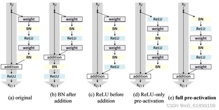preResNet ResNet的改进。preResNet整了residual模块中各层的顺序。相比经典residual模块(a),(b)将BN共享会更加影响信息的短路传播,使网络更难训练、性能也更差;(c)直接将ReLU移到BN后会使该分支的输出始终非负,使网络表示能力下降;(d)将ReLU提前解决了(e)的非负问题,但ReLU无法享受BN的效果;(e)将ReLU和BN都提前解决了(d)的问题。preResNet的短路连接(e)能更加直接的传递信息,进而取得了比ResNet更好的性能。