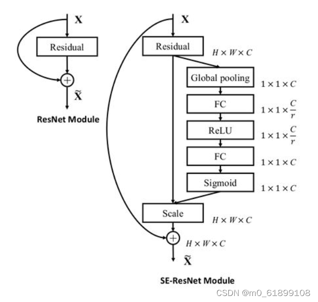 SENet ILSVRC 2017的冠军网络。SENet通过额外的分支(gap-fc-fc-sigm)来得到每个通道的[0, 1]权重,自适应地校正原各通道激活值响应。以提升有用的通道响应并抑制对当前任务用处不大的通道响应。