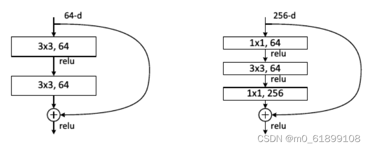 - 对于很深的网络(超过50层),ResNet使用了更高效的瓶颈(bottleneck)结构(右图)。