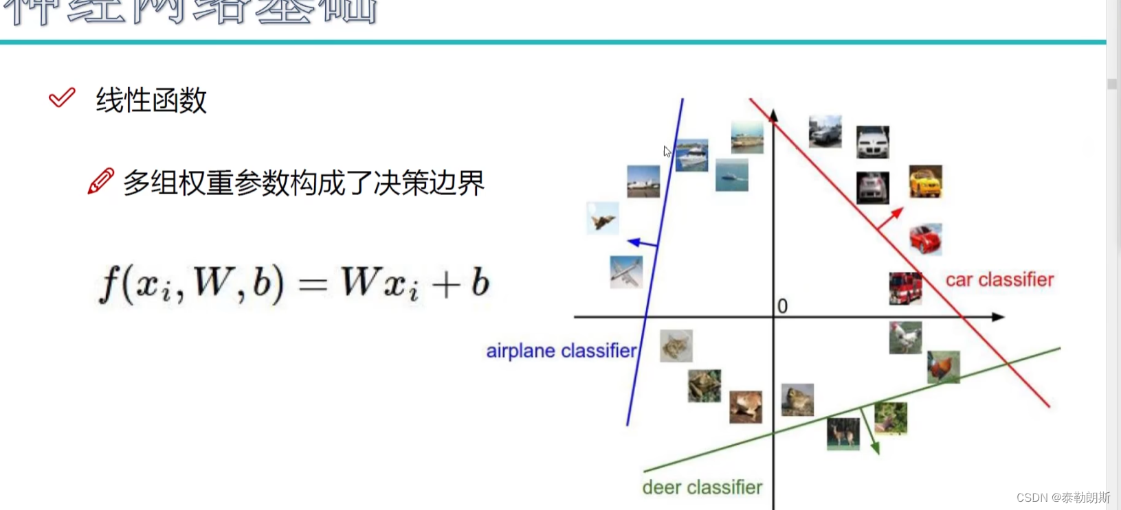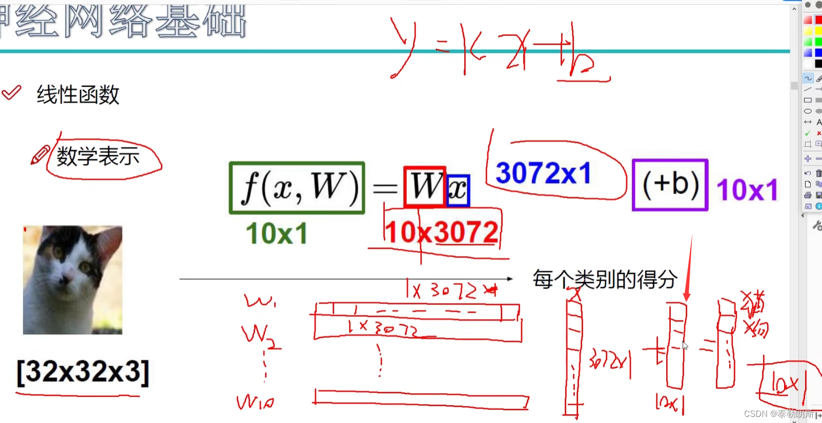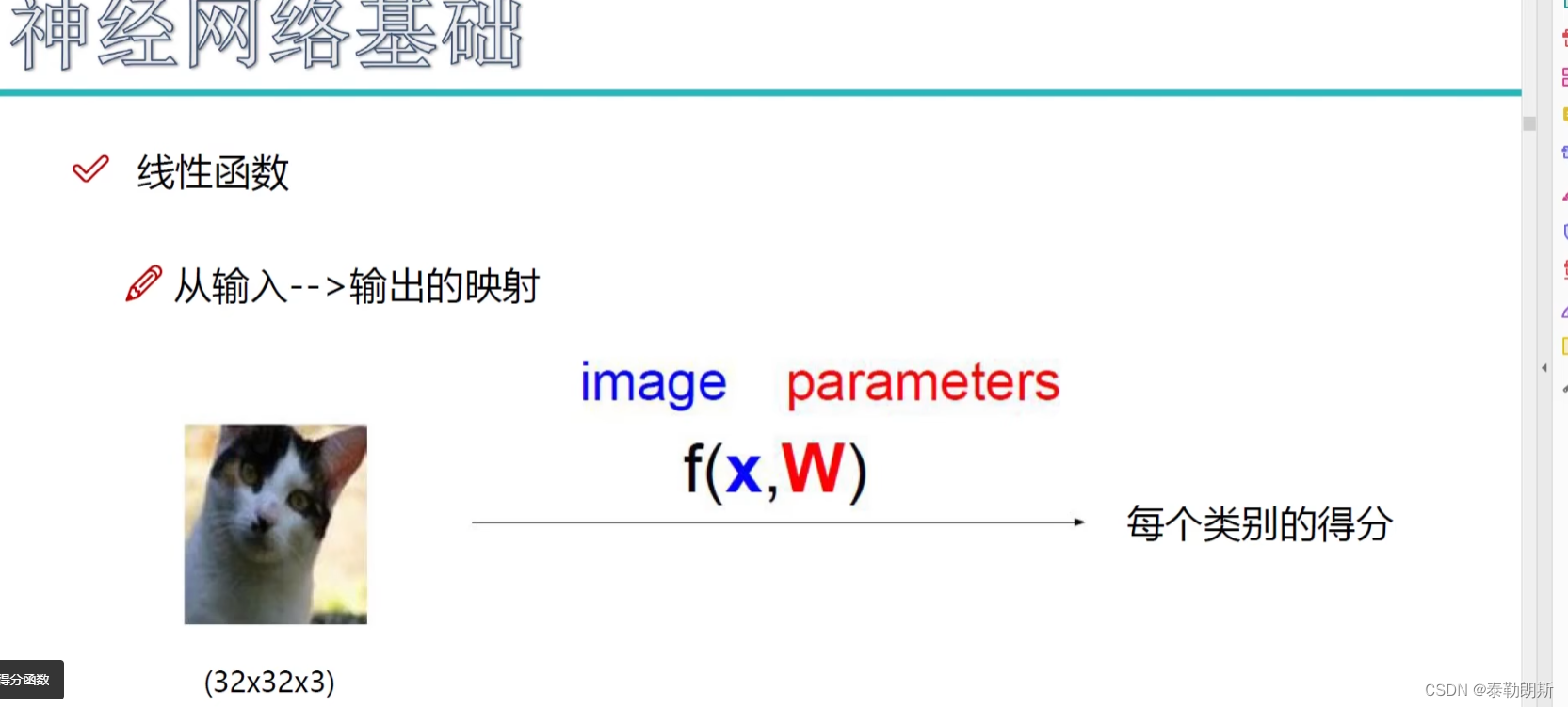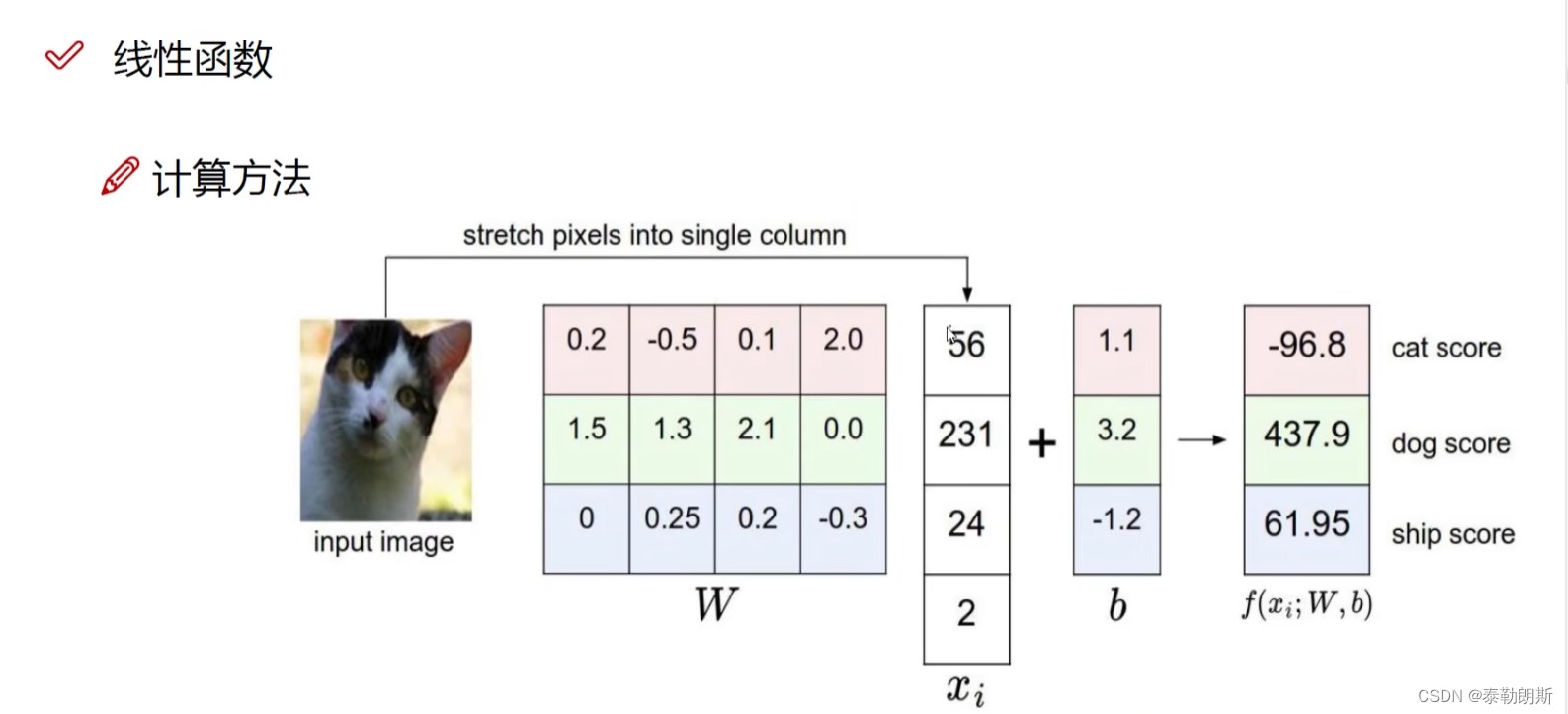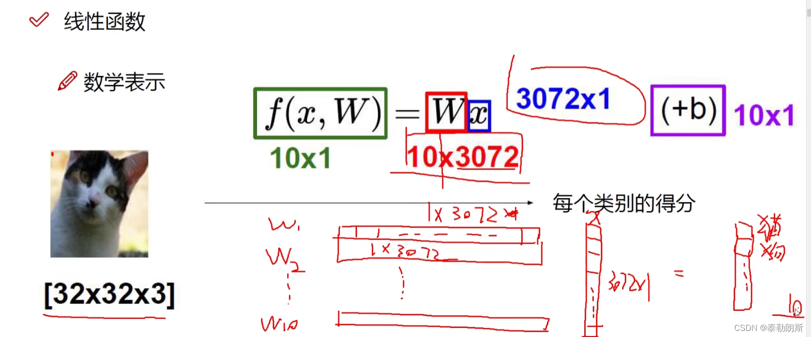 W是权重,X是像素,每个像素有一个权重,因为不同像素对结果影响不一样,一个类别一类权重。