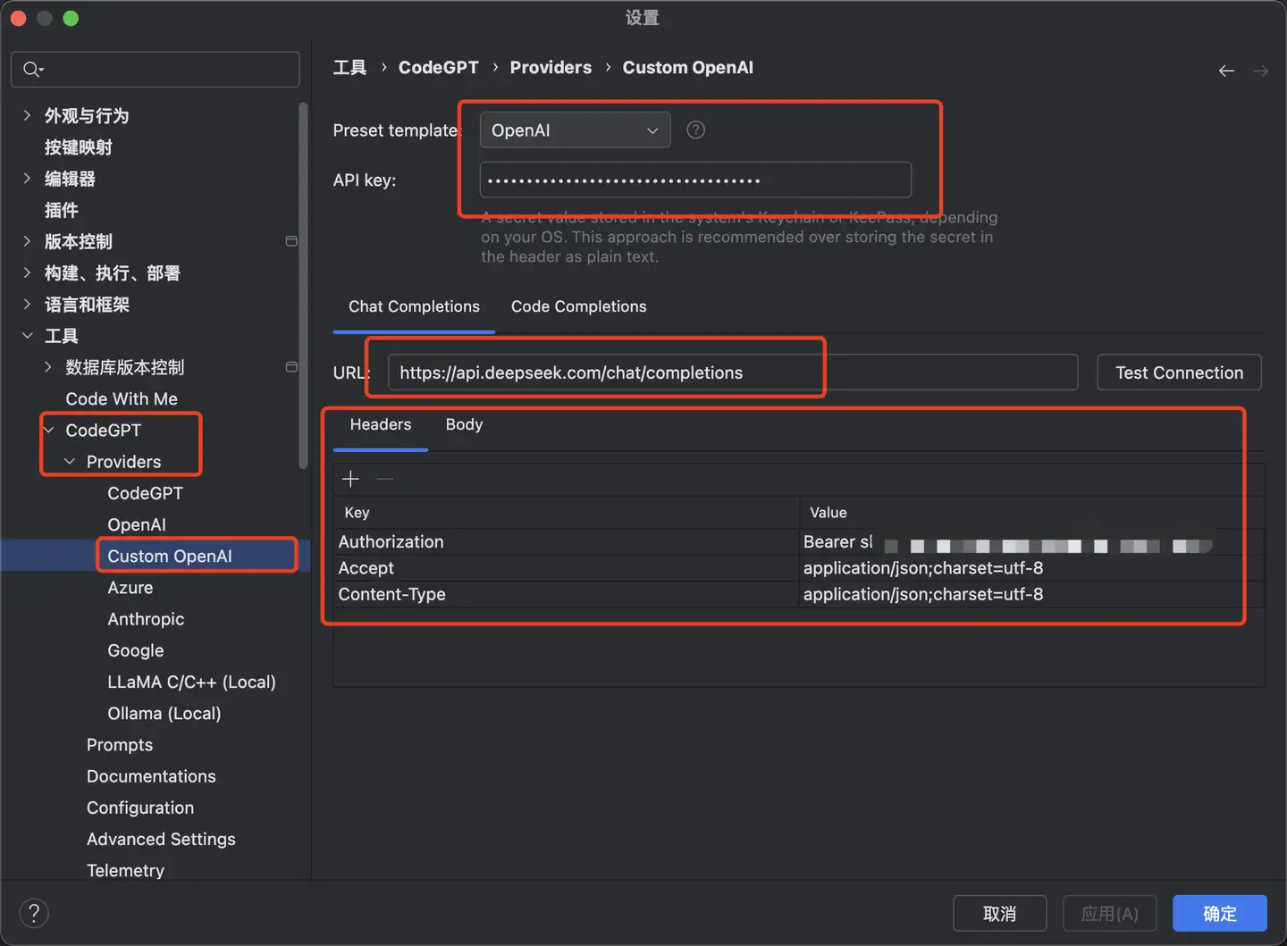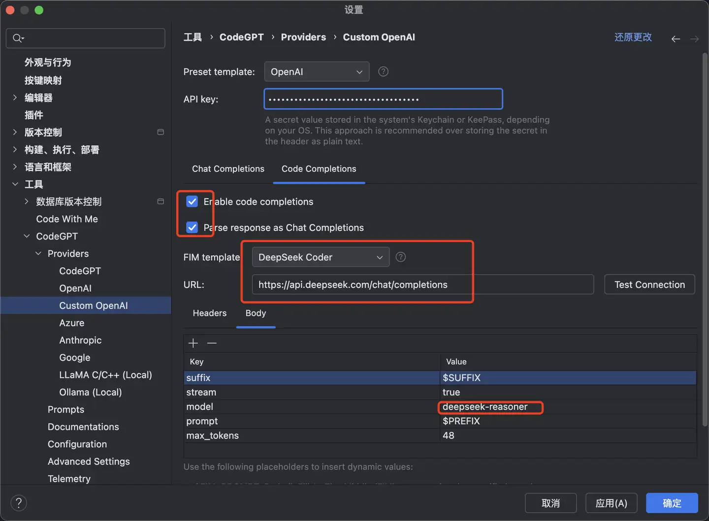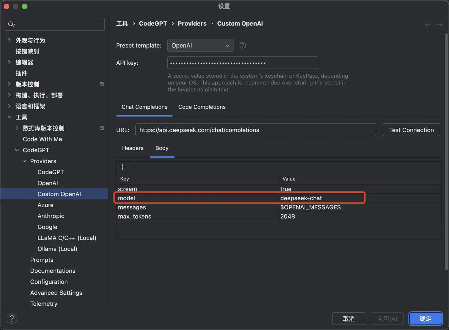 Providers中选择Custom OpenAI或CodeGPT。 - 输入API Key。
