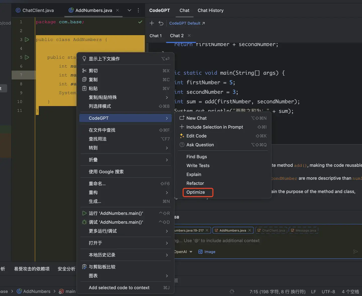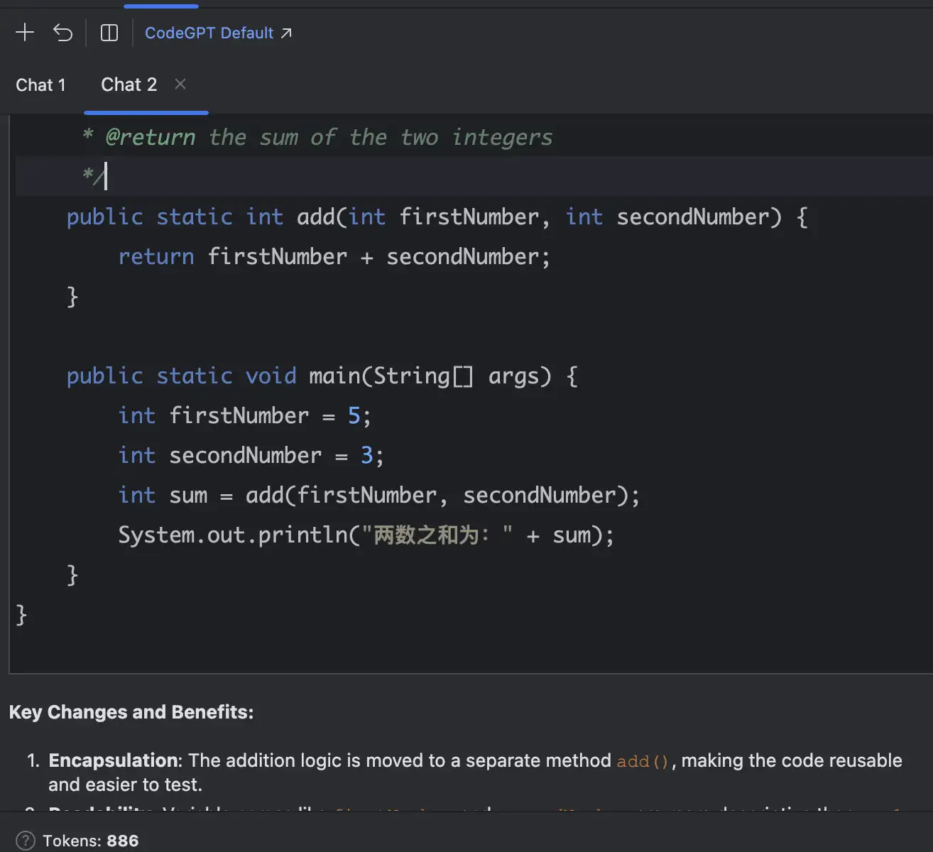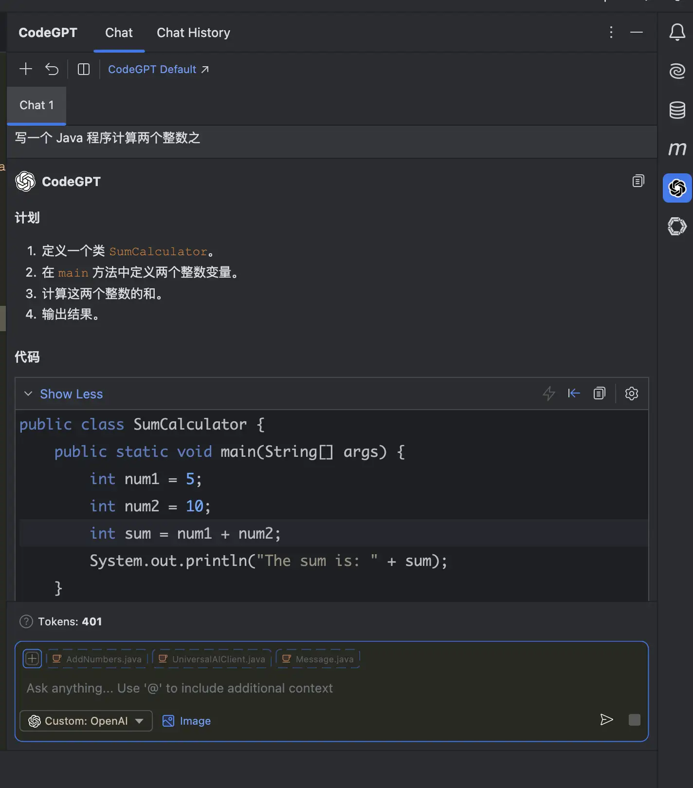 现在,使用 CodeGPT,我们只需要在 Java IDEA 中输入 “写一个 Java 程序计算两个整数之和”,然后按照前面说的步骤操作,CodeGPT 就会帮我们生成类似上面的代码,是不是节省了很多时间和精力?