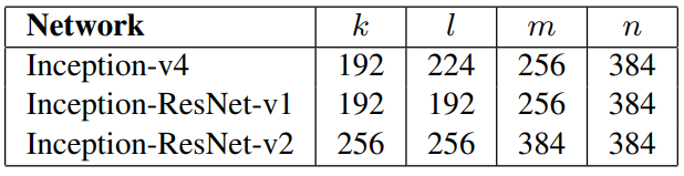 k和l表示卷积个数,不同网络结构的redution-A结构k和l是不同的。