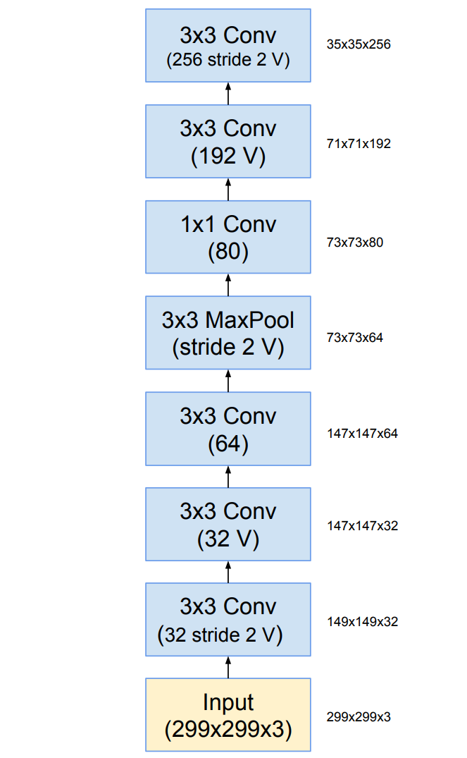 Stem结构: Inception-ResNet-V1的Stem结构类似于此前的InceptionV3网络中Inception结构组之前的网络层。