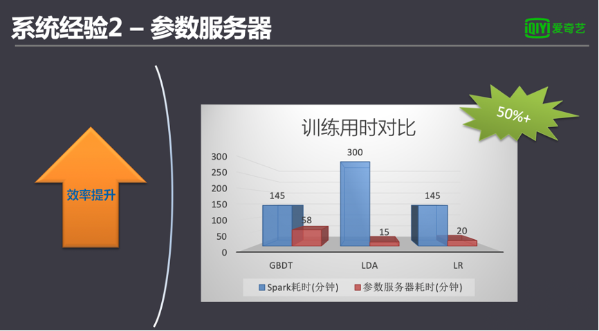 爱奇艺的机器学习平台在设计之初就支持跨算法框架调度。我们调研了多种开源的参数服务器,最终集成了腾讯的Angel参数服务器,并对一些典型模型做了测试。测试证明,在训练亿级以上规模的模型时,参数服务器的训练效率相对Spark有明显提升50%以上的速度。