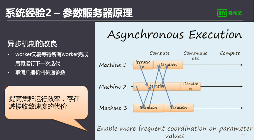 解决方案是通过参数服务器的方式解决,参数服务器本身原理上对分布式的训练进行了一些改良,并不是等所有的执行器跑完,等一部分跑完超过一个预值强行终止了。为了提高整个集群的效率牺牲了一些部分的收敛的速度,另外取消了广播机制来传递参数,把参数放在独立的叫做参数服务器里面,通过读取,这样子也节省了网络的消耗。
