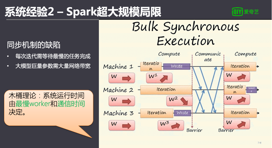 另一方面,在训练亿级以上的数据量时传统的SparkML训练相当慢甚至崩溃失败。这是因为Spark对超大规模的模型的训练并不擅长,Spark训练模型分多轮迭代,每一轮需要所有的执行器的任务做完后才汇总参数,根据木桶原理,整个Spark任务会受到最慢的worker运行时间影响。