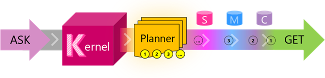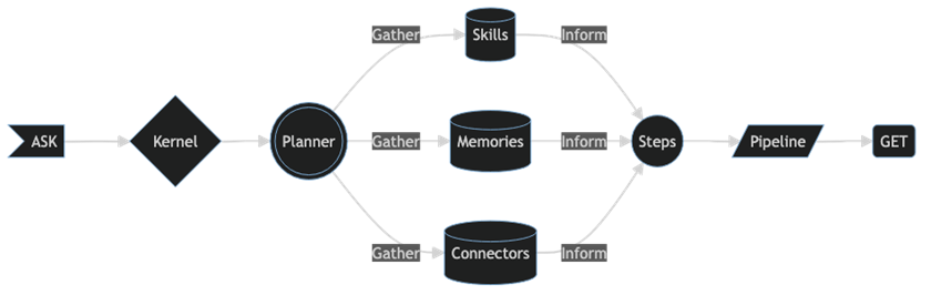 随着它们越来越能够理解复杂意图,大语言模型正在推动更加“目标导向”的问题解决方法。因此,SK 被创建时就以“ASK”为出发点。ASK 通过内核的编排能力驱动到动态通知的结果。从用户的提问到获得想要的结果,可以表示为一系列连接部件的流程: