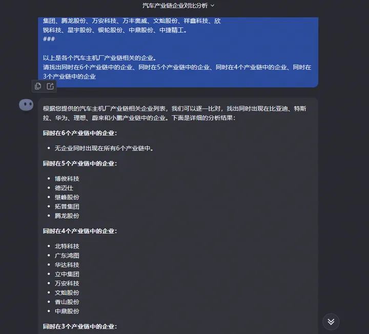 如果已经知道电动汽车产业链企业,要找出同时在几个汽车主机产业链中的企业,可以输入提示词: