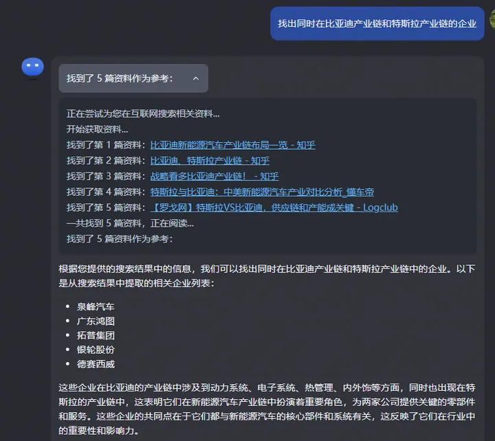 在kimichat中输入提示词:找出同时在比亚迪产业链和特斯拉产业链的企业