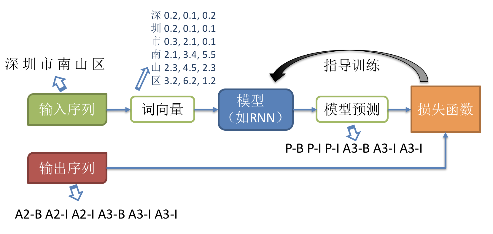 比如现在拿到一个快递单,可以作为我们的模型输入,例如“张三18625584663广东省深圳市南山区学府路东百度国际大厦”,那么序列标注模型的目的就是识别出其中的“张三”为人名(用符号 P 表示),“18625584663”为电话名(用符号 T 表示),“广东省深圳市南山区百度国际大厦”分别是 1-4 级的地址(分别用 A1~A4 表示,可以释义为省、市、区、街道)。