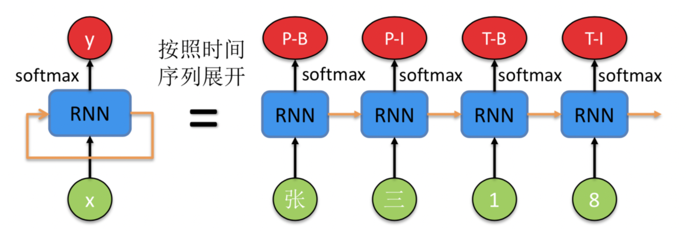 右边是按照时间序列展开的示意图,注意到蓝色的 RNN 模块是同一个,只不过在不同的时刻复用了。这时候能够清晰地表示序列标注模型的输入输出。