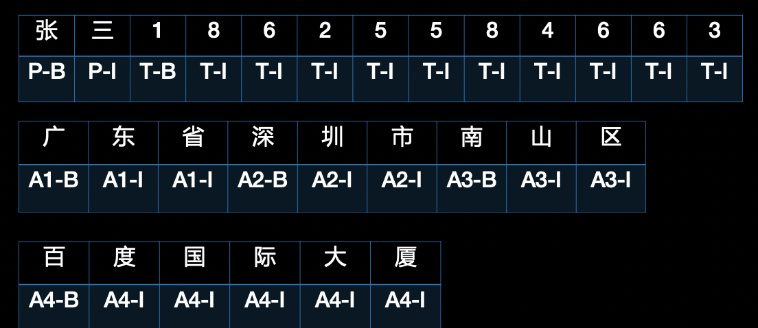 对于句子“张三18625584663广东省深圳市南山区百度国际大厦”,每个汉字及对应标签为: