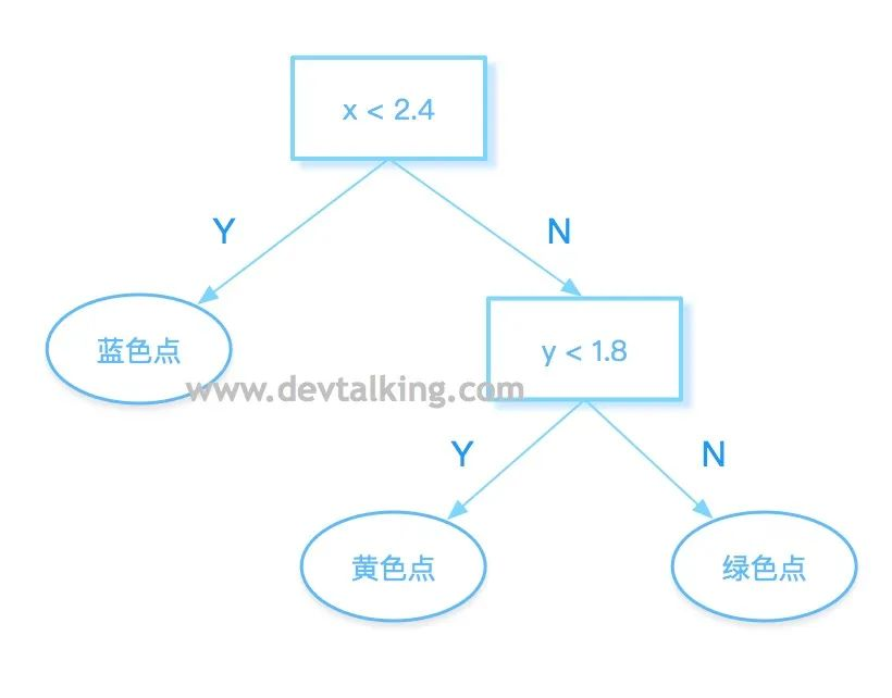 的区域,所以第一个根节点就直接可定义为xx是否小于2.4,既样本数据的某一个特征数值是否小于2.4,如果小于2.4,那么将该样本点判定为蓝色分类的点。
