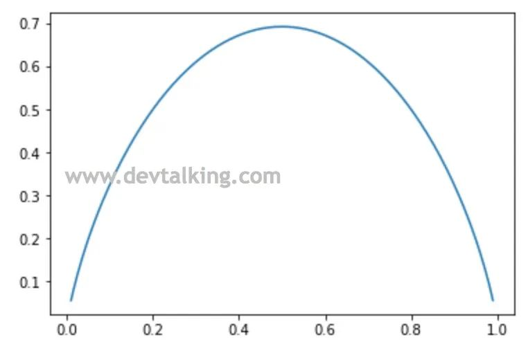 这一小节我们在Jupyter Notebook中将信息熵的曲线绘制出来再让大家感性的理解一下。假设一组信息中有两个类别,那么当一个类别所占比例为