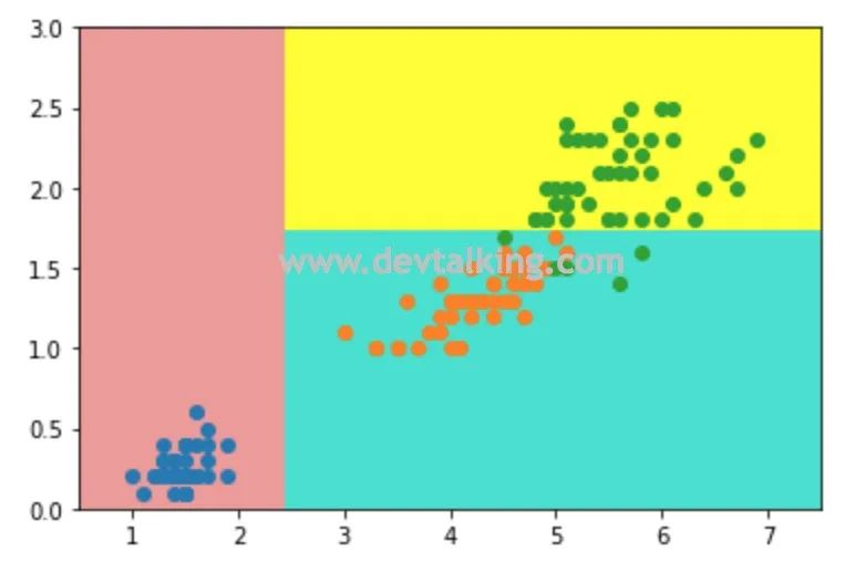 我们同样使用鸢尾花的数据进行验证,在验证之前,我们先将之前通过Scikit Learn的决策树求出的鸢尾花决策边界的图贴出来,做以对比:
