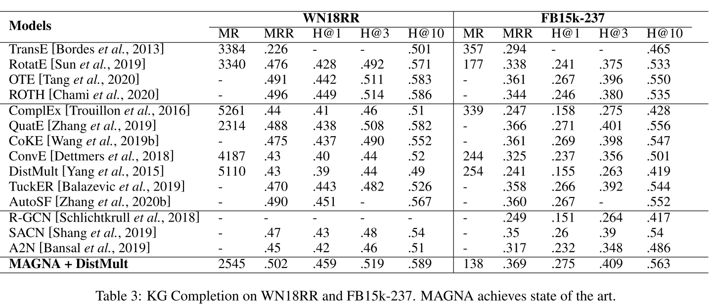 我们将MAGNA与最先进的基线进行了比较,包括(1)基于翻译距离的模型:TransE [Bordes et al., 2013]及其最新扩展RotatE [Sun et al., 2019]、OTE [Tang et al., 2020]和ROTH [Chami et al., 2020];(2)基于语义匹配的模型:ComplEx [Trouillon et al., 2016], QuatE [Zhang et al., 2019], CoKE [Wang et al., 2019b], ConvE [Dettmers et al., 2018], DistMult [Yang et al., 2015], TuckER [Balazevic et al., 2019]和AutoSF [Zhang et al., 2020b];(3)基于gnn的模型:R-GCN [Schlichtkrull等人,2018],SACN [Shang等人,2019]和A2N [Bansal等人,2019]。