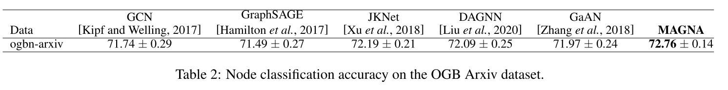 对于Cora, Citeseer和Pubmed数据集,使用6个MAGNA块,隐藏维度512和8个注意头。对于大规模ogbn-arxiv数据集,使用2个隐藏维度为128的MAGNA块和8个注意头。
