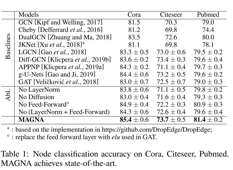 报告了(表1)从每个MAGNA层中去除MAGNA各组成部分(层归一化、注意扩散和前馈层)后的模型性能。注意,该模型相当于没有这三个组件的GAT。我们观察到扩散和层归一化在提高所有数据集的节点分类性能方面起着至关重要的作用。由于MAGNA以递归方式计算注意力扩散,因此层归一化对于确保训练稳定性至关重要。同时,与GAT(见表1倒数第二行)相比,注意扩散允许每层中的多跳注意,从而有利于节点分类