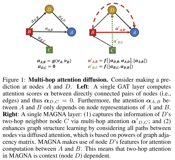 该文提出了一种有效的多跳自注意机制——多跳注意图神经网络(MAGNA)。MAGNA使用了一种新颖的图注意力扩散层(图1),首先计算边缘上的注意力权重(用实线箭头表示),然后通过使用边缘上的注意力权重的注意力扩散过程,计算不相连的节点对之间的自注意力权重(虚线箭头)。