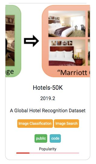 此外,每个数据集都有多个标签,如图像分类、目标检测、图像搜索、3D 重建等,还标注了数据集的公开状态、是否已有代码,以及数据集的流行度。