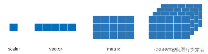 一个Tensor是一个包含单一数据类型的高维矩阵,一般而言,描述Tensor的高维特性通常用三维及以上的矩阵来描述,例如下图所示:单个元素叫标量(scalar),一个序列叫向量(vector),多个序列组成的平面叫矩阵(matrix),多个平面组成的立方体叫张量(tensor)。当然,就像矩阵有一维矩阵和二维矩阵乃至多维矩阵一样,张量也无需严格限制在三维以上才叫张量,在深度学习的范畴内,标量、向量和矩阵都统称为张量。