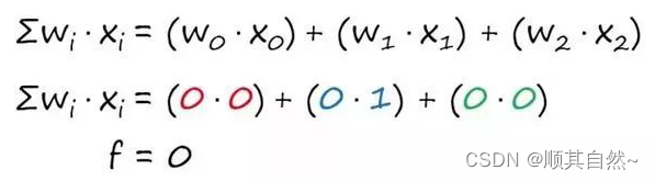 最终结果是 0,此时用「f」表示这个暂时的结果。(只是加权加和的结果,还没有和阈值比较,判断是否可以激活,所以并不是最终输出结果)