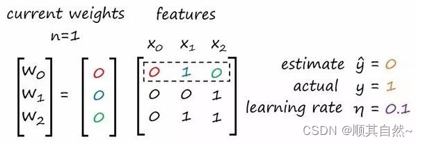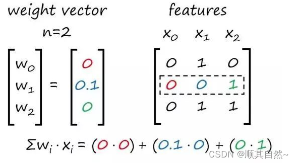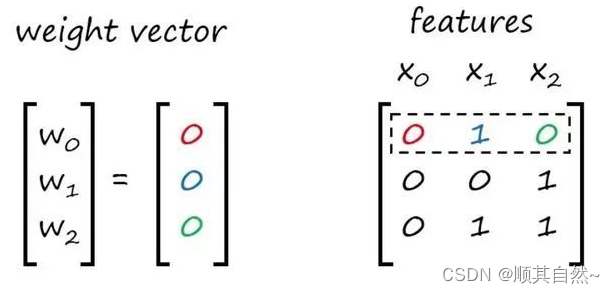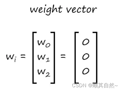 权重数量要和特征数量相同。假设我们有三个特征,权重向量如下图所示。权重向量一般会初始化为 0,此例中将一直采用该初始化值。