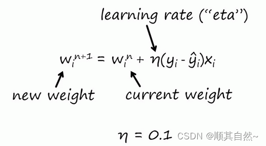 为了调整权重,我们需要设定「学习率」,用希腊字母「eta(η)」标记。我将学习率设为 0.1,当然就像阈值一样,你也可以用不同的数值。