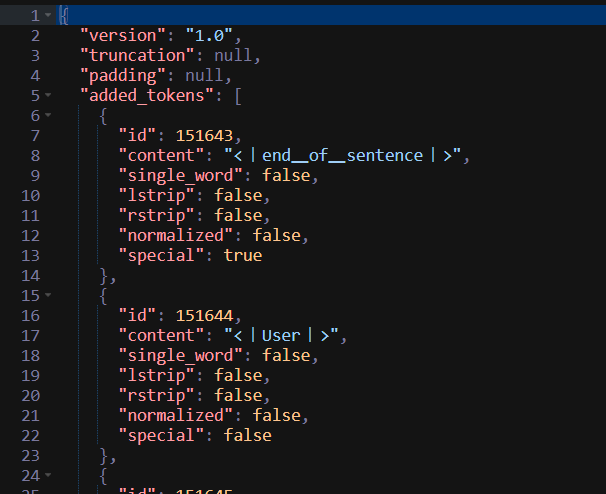 文件开头标明了配置文件格式版本version、长文本截断策略truncation、填充策略padding,后接自定义标记added_tokens,以id对应content,并记录是否为特殊功能标记;