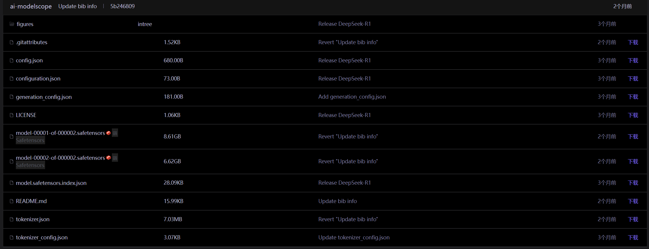 这里以魔塔社区中DeepSeek-R1-Distill-Qwen-7B为例子,从每个文件的作用开始说明,我们可以看见,一个大模型的文件主要有以下几个文件: