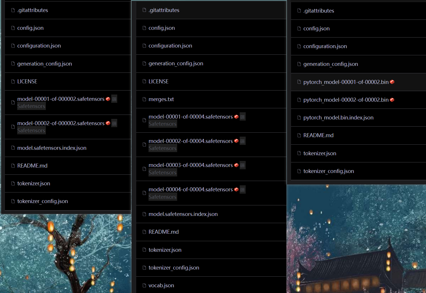 先不急着了解他们的具体作用,我们再多看几个大模型的文件做一下对比,最左边为第一个模型DeepSeek-R1-Distill-Qwen-7B,后两个分别为通义千问2.5-7B-Instruct和deepseek-llm-7b-chat模型做对比: