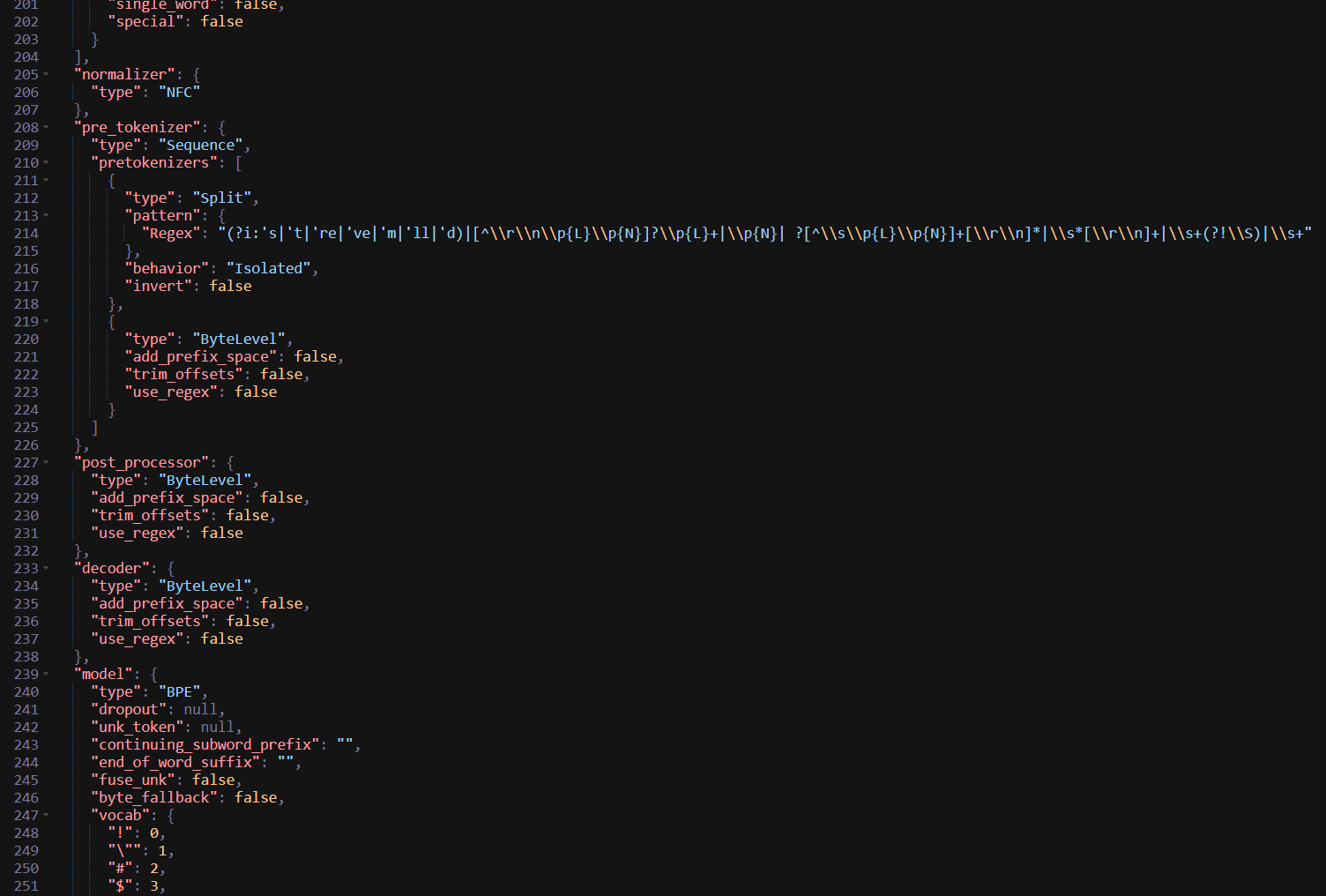 再看看deepseek系统与qwen系列模型的区别,主要是qwen系列模型多了两个文件:merges.txt,vocab.json,这两个文件是词汇表文件,vocab文件包含模型所用的词汇表,即词与编码的映射关系;merges.txt文件则是用于字节对编码(BPE, Byte Pair Encoding)分词算法的文件,BPE有关知识后续再详细说明。