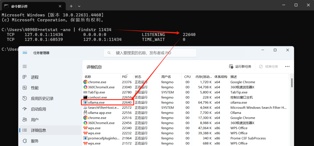默认Ollama API会监听11434端口,可以使用命令进行查看