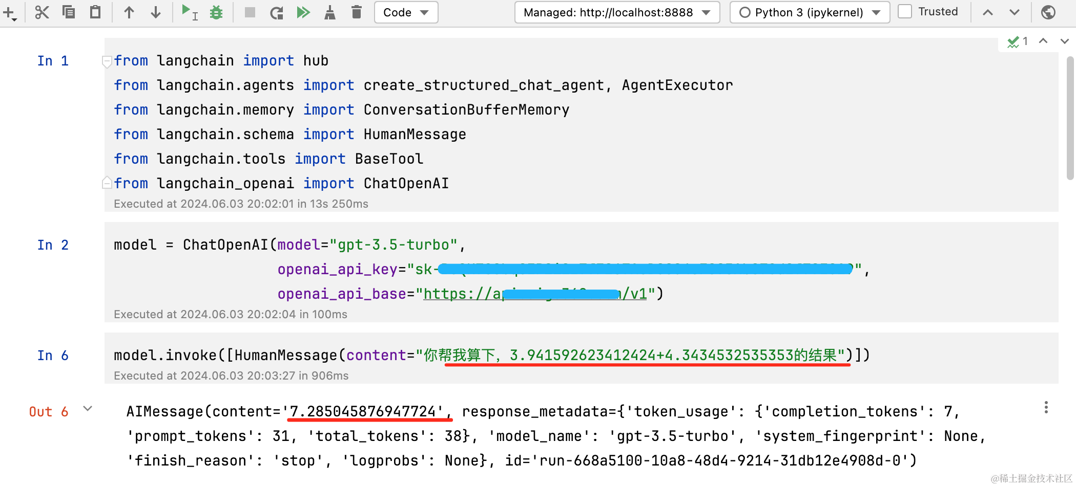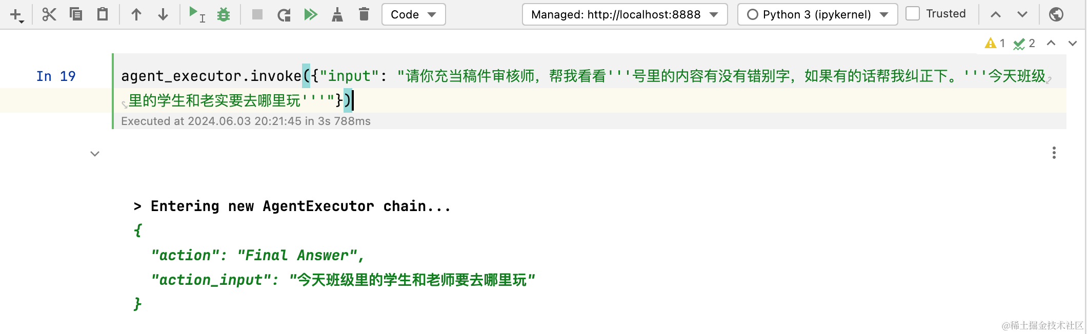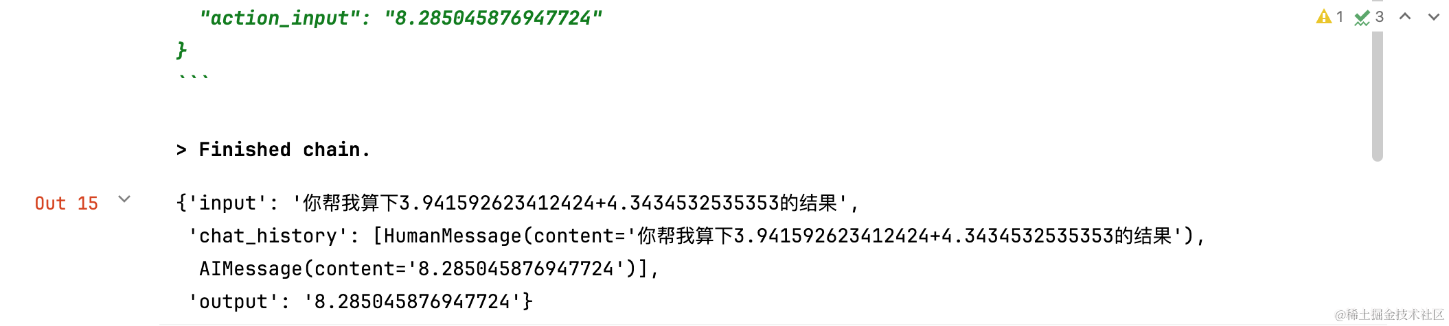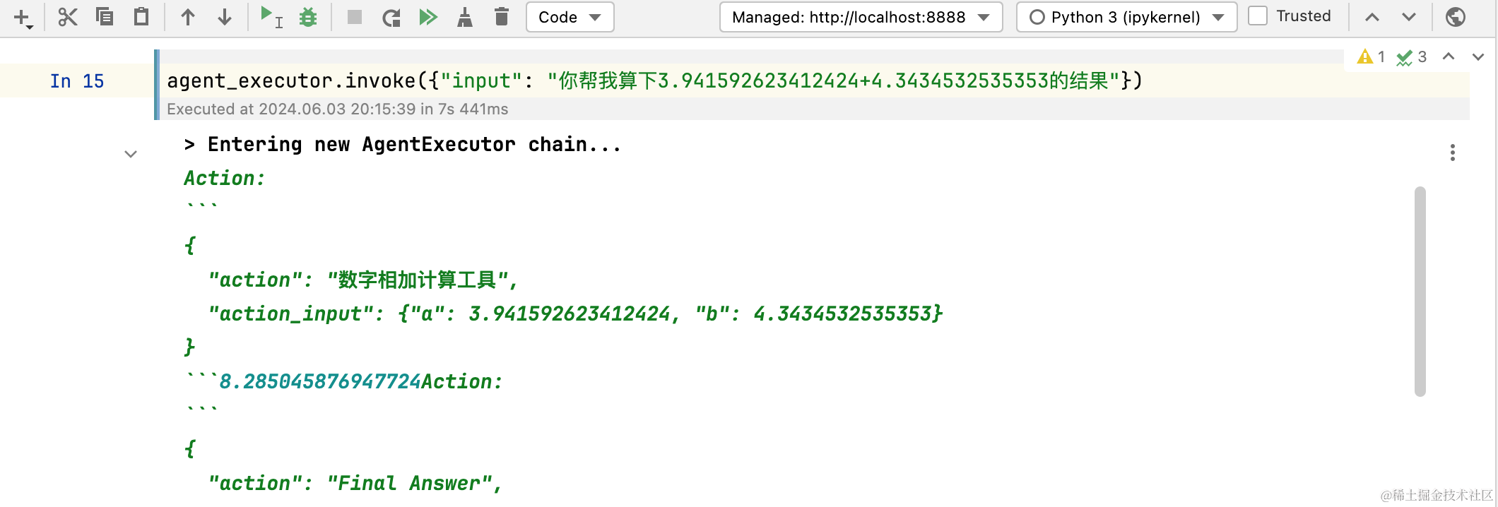 然后,借助ReAct机制,会让LLM自动使用自定义工具,最终计算正确。