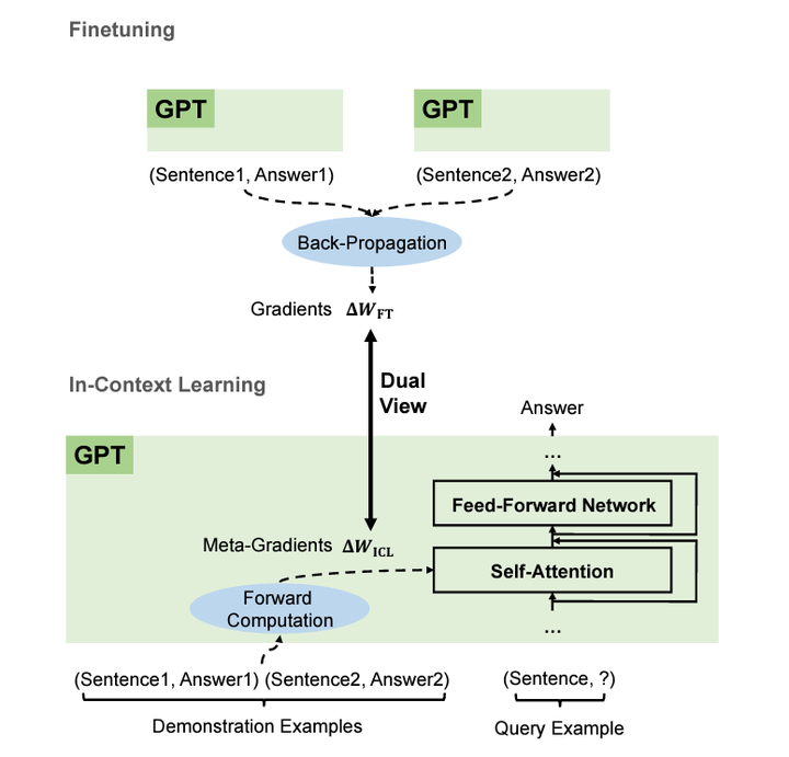 从标题看出,它认为 In-context learning 在 prompt 给出的示例上隐式地做了梯度下降,如下图所示。论文我还没有详细读,细节之后再来补充。
