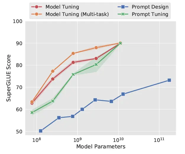 Prompt-Tuning 针对的是自然语言理解任务(NLU),实验数据集是 SuperGLUE。注意到,模型规模到达 10B 时,Prompt-Tuning 与全参数微调在 SuperGLUE 下游任务上打成平手。但是在小模型上,仍有不小的差距。