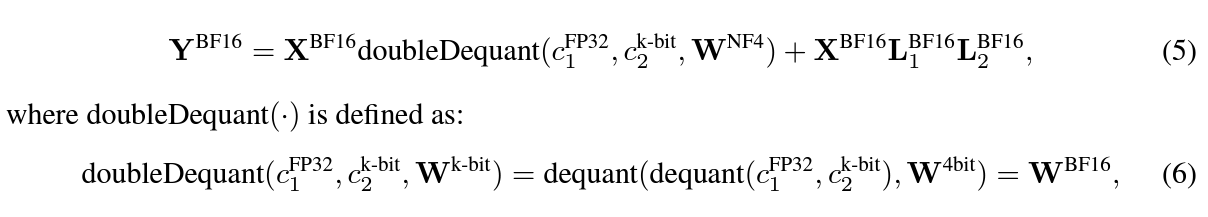 QLoRA 中,模型的权重有两种格式:用 NF4 存储;用 BF16 计算。需要用相应权重计算前向传播时,对 NF4 的权重反量化为 BF16(下图公式 5);计算结束后,再量化为 NF4( �NF4 ).