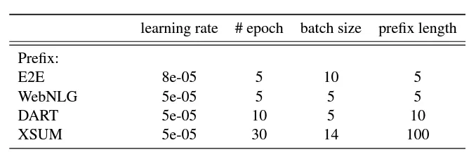 Prefix-tuning 论文中关注了两个下游任务:Table-to-text Generation 以及 Summarization,都属于自然语言生成任务(NLG)。prefix 的长度是一个重要的超参数。论文提到,在到达阈值之前(对于 Table-to-text 任务大约是 10;对于 Summarization 任务大约是 100),prefix 越长效果越好;超过阈值后效果会有轻微下降。