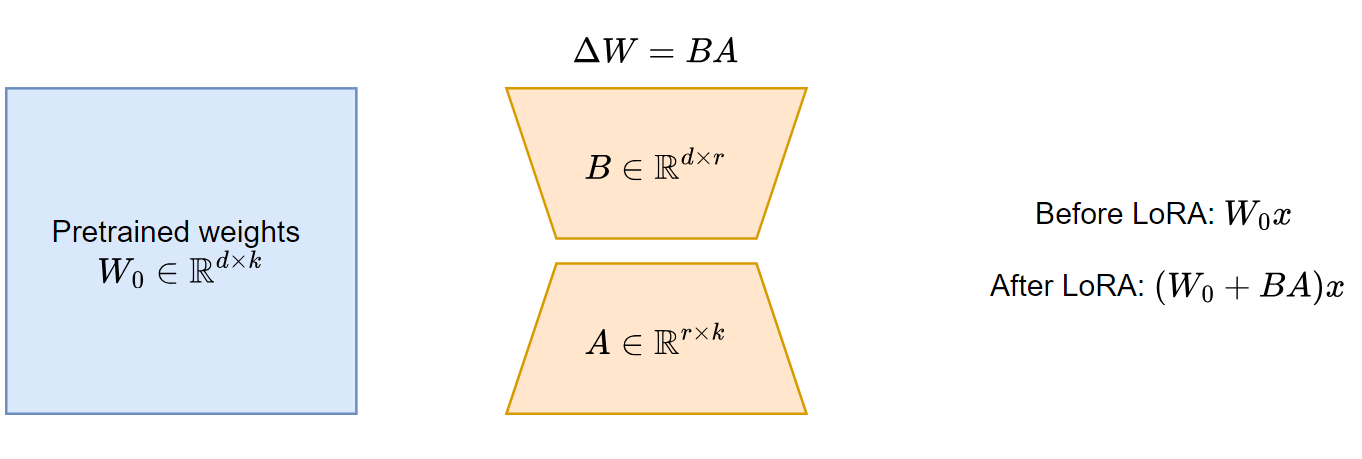 LoRA 微调时,原来模型参数冻结,只更新 A 和 B 的参数。其中 � 称为 rank,是一个重要的超参数。 � 越大,可训练参数越多,表达力越强,不过一般也不需要太大, �=4,8,16 是常见的设置。